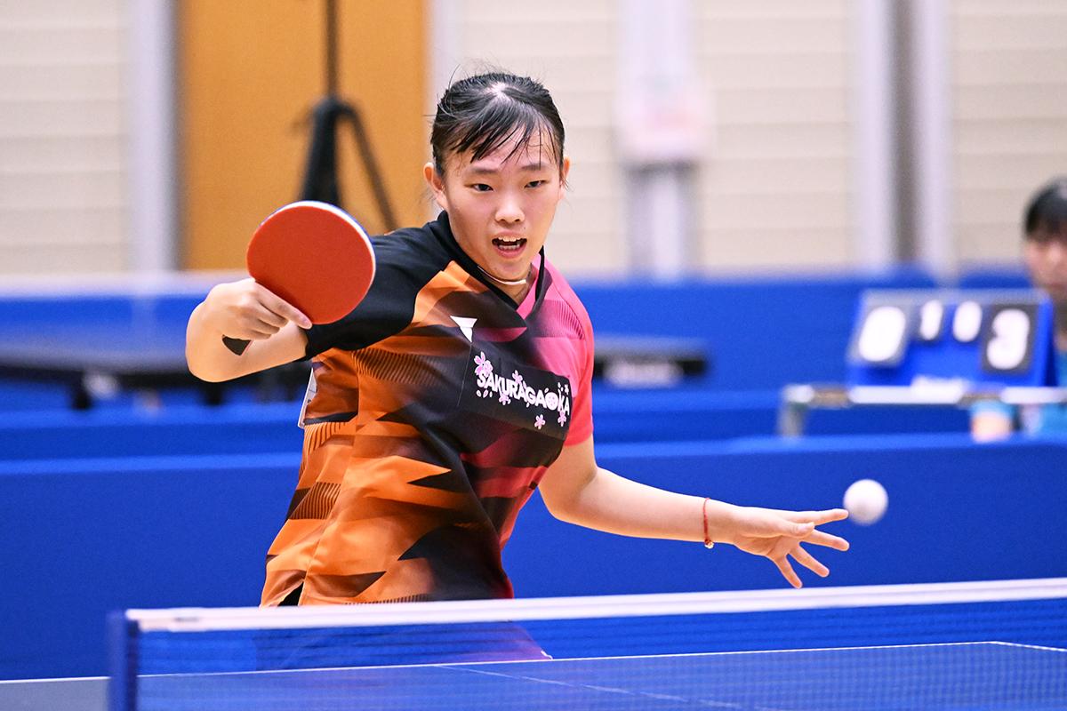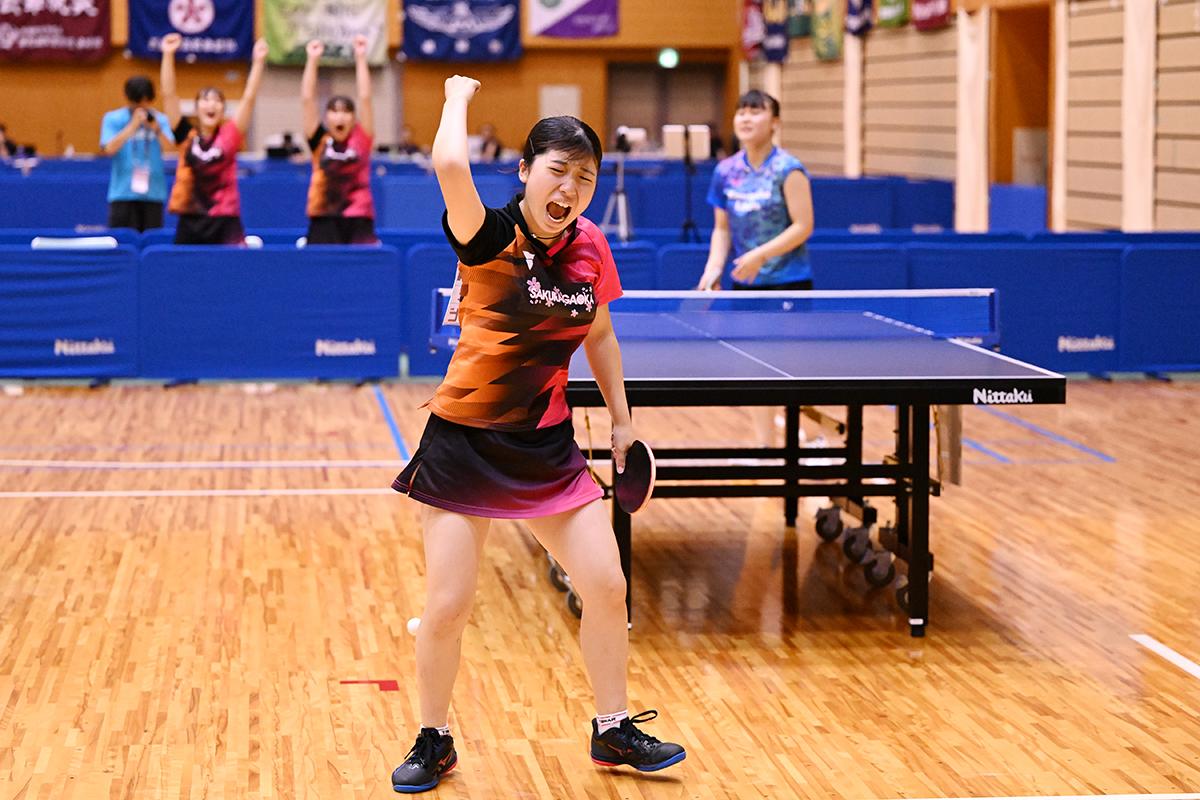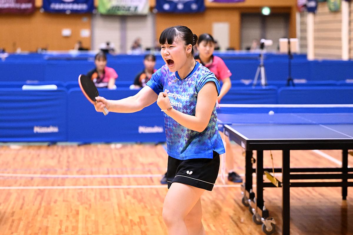 続く2番の竹谷対栗山は、ゲームオールの大激戦の末に、竹谷が勝利し、すかさずリベルテが追い付く展開。序盤は栗山の回転量の多い両ハンドにミスが目立った竹谷だが、足を使って粘り強くボールをねじ込み、1年生とは思えない忍耐力と対応力で接戦を制した。