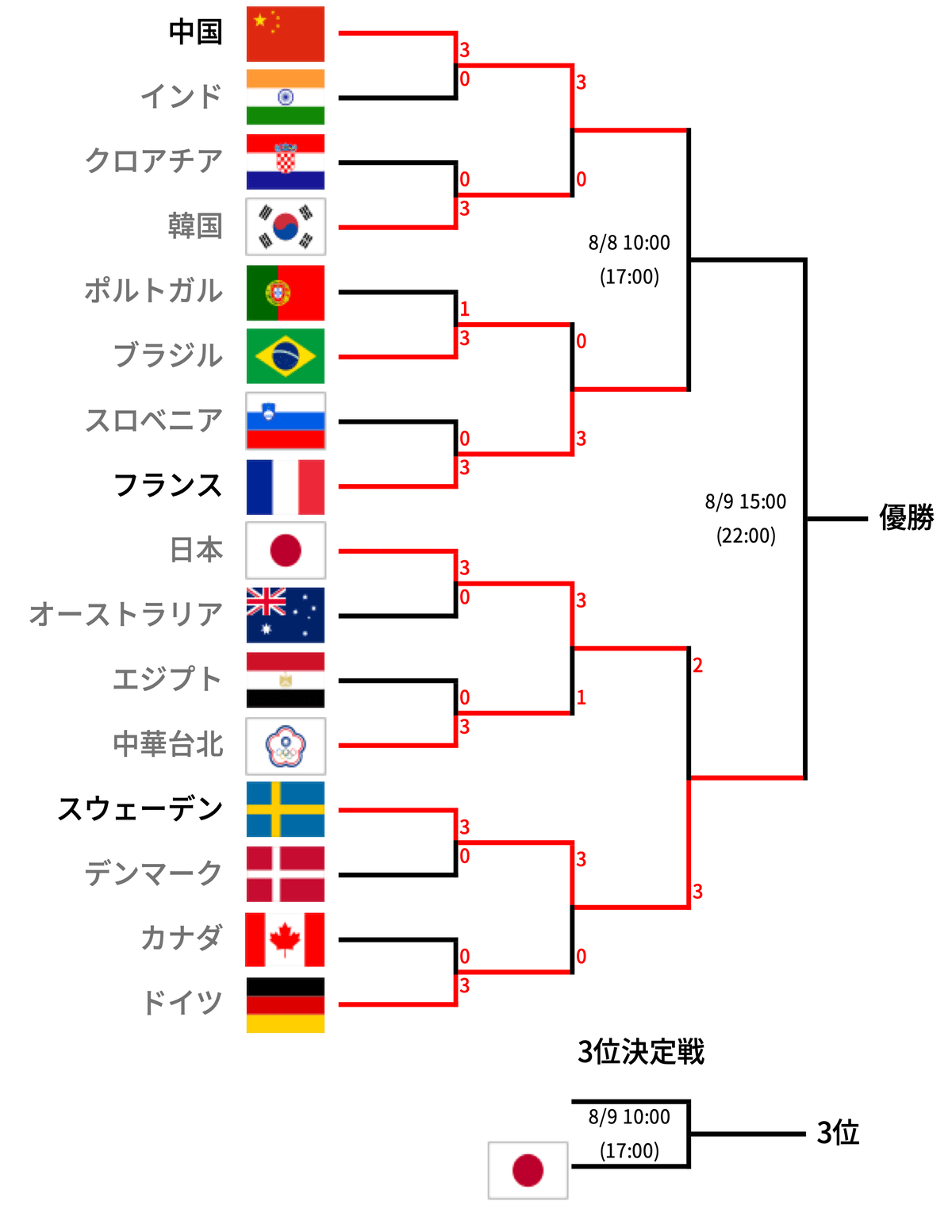 ヨーロッパのチームの勝利にパリの会場は歓喜に沸いた。スウェーデンは東京五輪で敗れた日本にリベンジを果たし、五輪の男子団体で初の決勝進出。団体では初のメダルを確定させた。日本はフランスと中国で行われる準決勝の敗者と銅メダルをかけて争う。