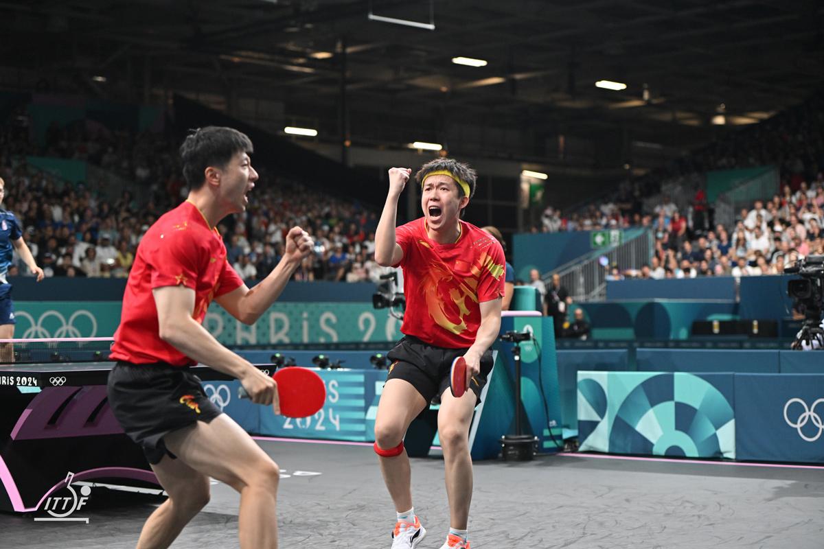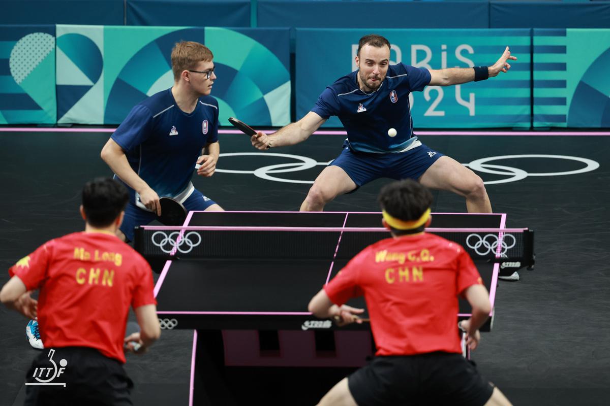 ダブルスは序盤、果敢なカウンターを狙ったフランスペアがリードするも、中国ペアは質の高いドライブで逆転。ゴズィーが逆チキータや中後陣からのバックハンドドライブなどで見せ場をつくるが、中国ペアはビッグラリーもきっちり制して、フランスペアをストレートで破り中国が先制点。