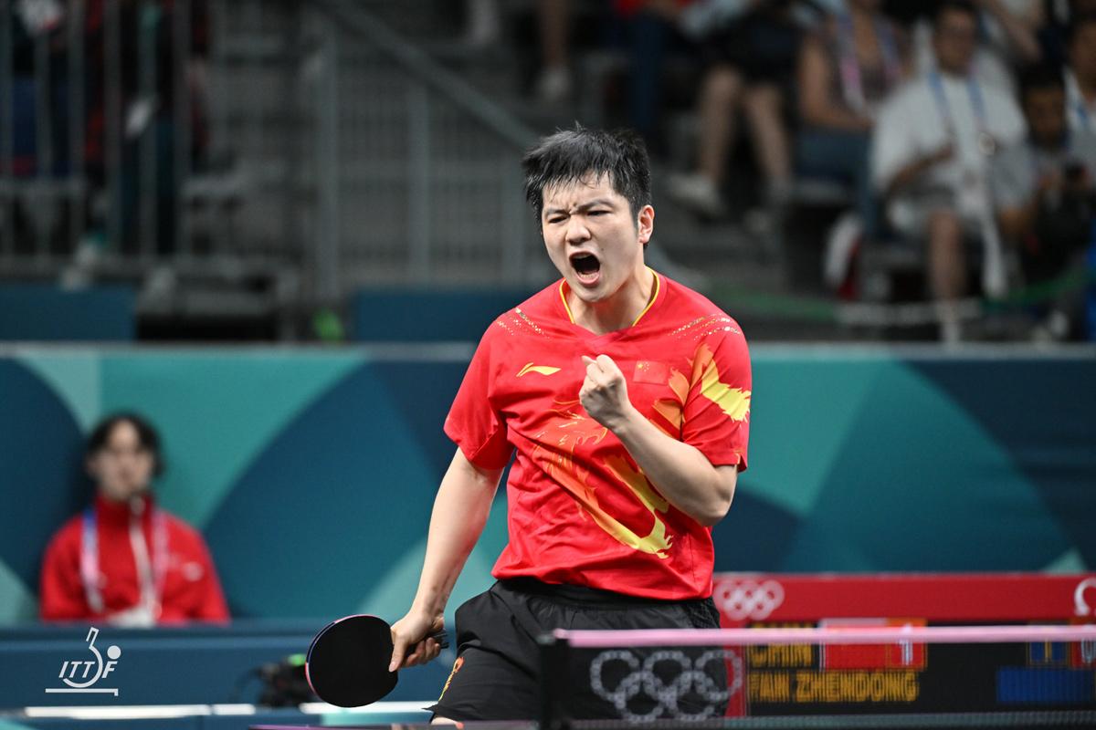 攻め込むF.ルブランに全力で応戦する樊振東という構図が続き、競り合いに。ジュースはF.ルブランが5度のマッチポイントをスーパープレーでしのぐが、最後は樊振東が決めて、エース対決は中国に軍配。