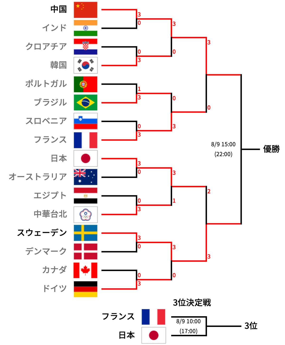中国は決勝でスウェーデンと、フランスは銅メダル決定戦で日本と対戦する。