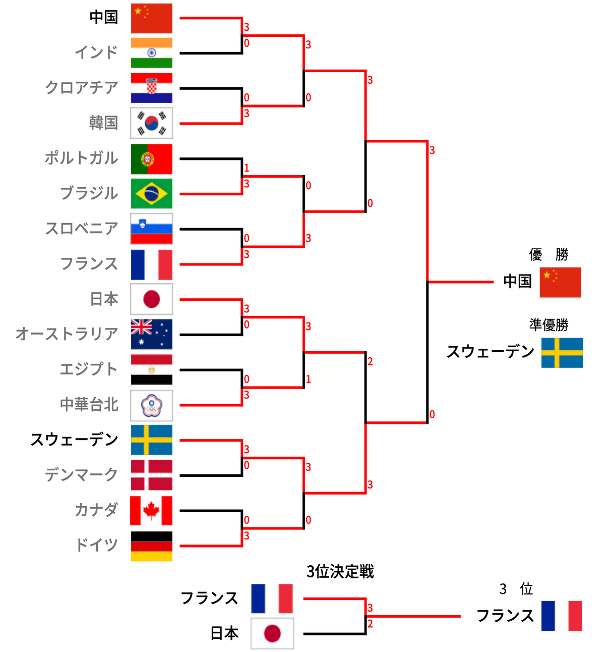 | 中国 | 3-0 | スウェーデン | ||||