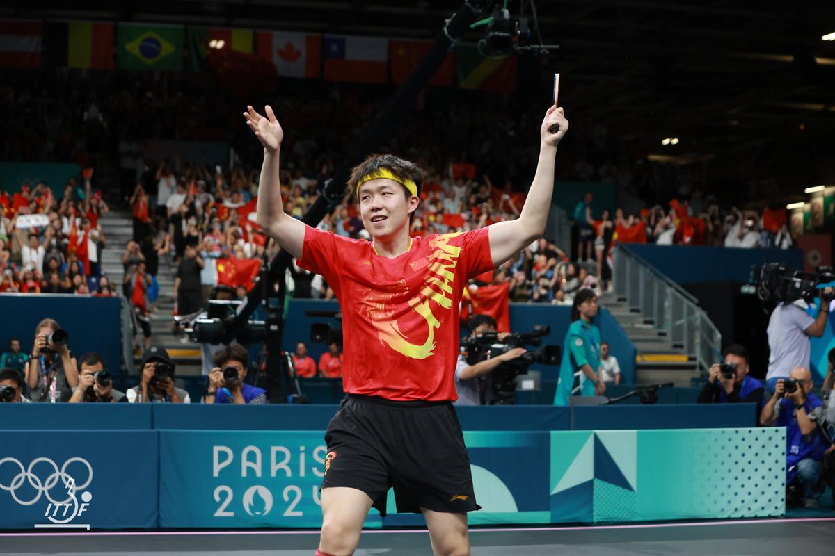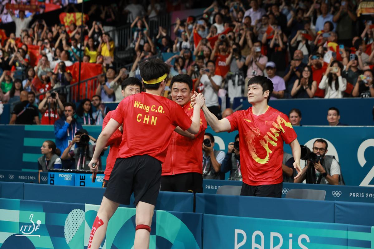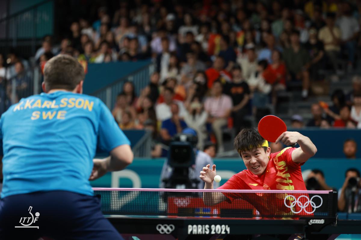3試合目のゲームオールは、ここでも最終ゲームの中国勢のスタートダッシュが決まった。K.カールソンはバック伸ばし連打で2-4と王楚欽を追うがここから王楚欽が怒涛(どとう)の攻めを見せて6本連取。最後は10-2から、K.カールソンがバックハンドロングサービスから3球目をフォアで狙い打ったボールが当たりそこねてアウト。レシーブがネットした王楚欽が両手を上げ、頭を下げK.カールソンに謝罪の意を示すと、振り返ってそのまま両手を広げ中国ベンチと観客に、4年に1度の優勝を逃さなかったことを噛みしめるように何度もアピールした。
