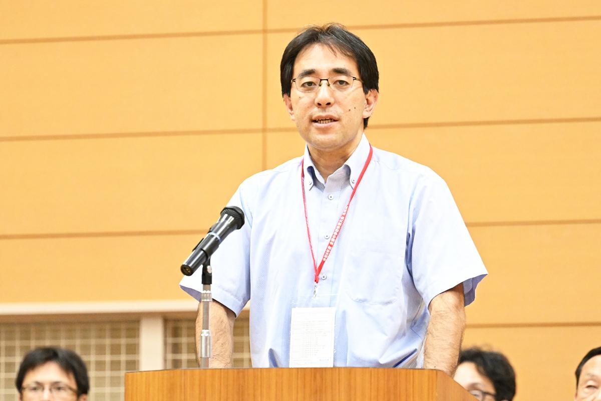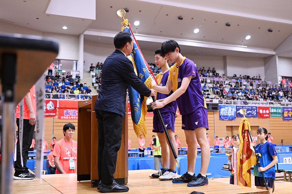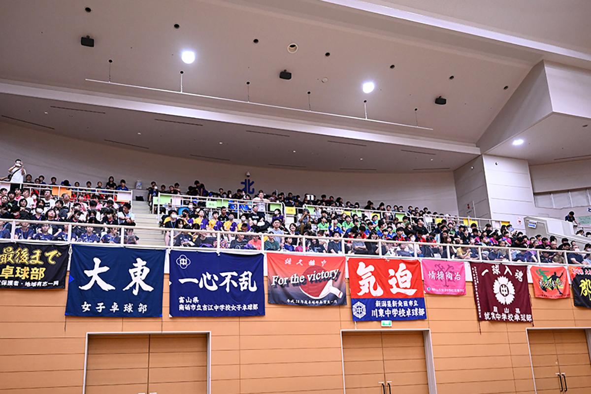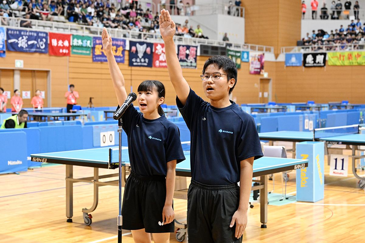 試合に先駆けて行われた開会式は、選手たちが観客席に着席して進行。神村義裕中体連卓球競技部長が開会を宣言すると、国旗・諸旗掲揚に続き、前回男子団体優勝の愛工大名電中(愛知)と女子団体優勝の星槎中(神奈川)が優勝旗を返還。新宮領穀中体連常務理事があいさつを述べ、今野啓審判長が競技場の注意と選手たちへの激励を述べた後、黒岩蒼空選手(糸魚川中)と結城里依選手(三島中)が元気よく選手宣誓を行い、熱戦を誓った。