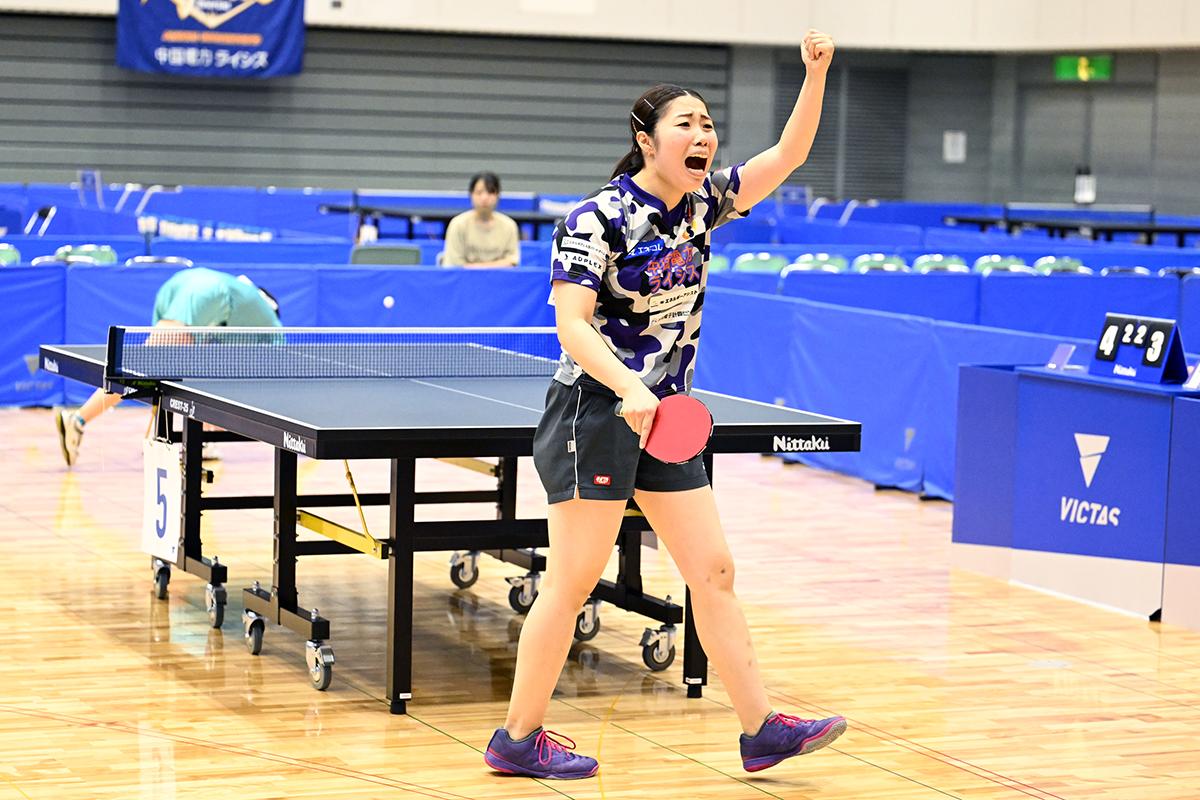 この試合も準決勝同様、互いが点を取り合う展開でラストまでもつれたが、枝廣がゲームカウント1対2の苦しい展開から粘り強く両ハンドを繰り出して筑波大学ツインエースの一人・牧野に逆転勝利し、中国電力ライシスが3年ぶりの団体戦日本一の栄冠をつかんだ。