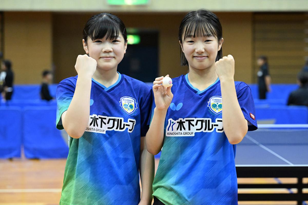 女子ダブルスの決勝は、木下アカデミー勢の同士打ちとなった。全中王者の高橋青葉と、昨年のカデット13歳以下2位の瓜生日咲の実力者ペアが優勢かと思われたが、村山未来/南芹那が、瓜生のカットと高橋の攻撃に落ち着いて対応。安定したプレーの南が、決定力の高いドライブとスマッシュを持つサウスポーの村山をアシストし、ストレート勝ちで初優勝を決めた。