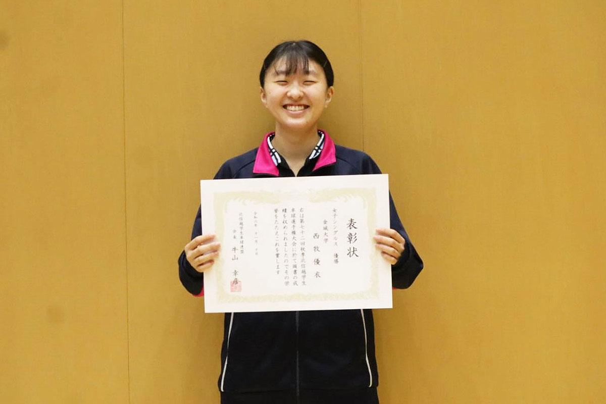 今大会は4年生の引退試合でした。最後は団体戦優勝を目標に毎日チーム全体で練習に励みましたが、団体戦の優勝を逃してしまい、さらにダブルスも優勝することができませんでした。なので、シングルスだけでも優勝しようという思いで臨んだ結果、チームの応援もあり、優勝できてとてもうれしかったです。