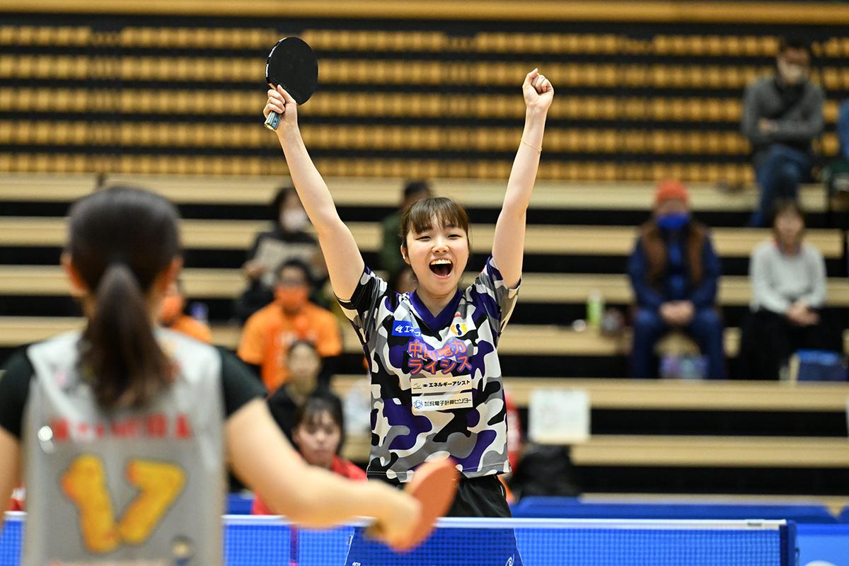 1番でゴールド(レンタル)選手の橋本が鋭いカットと反撃で永尾との競り合いを制すと、2番で野村が粘り強くチャンスをうかがい、チャンスをしっかり仕留める充実のプレーで牛嶋のカットを攻略し、王手。