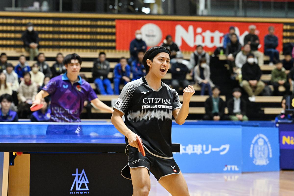 トップから宇田の剛球対髙見の高速両ハンドが真っ向からぶつかり合う激戦になるが、宇田がゲームオールジュースで勝利して、前期リーグで敗れている髙見に借りを返すと、2番の選手兼監督の松平も気迫みなぎるプレーで定松を下し、すかさず王手をかける。