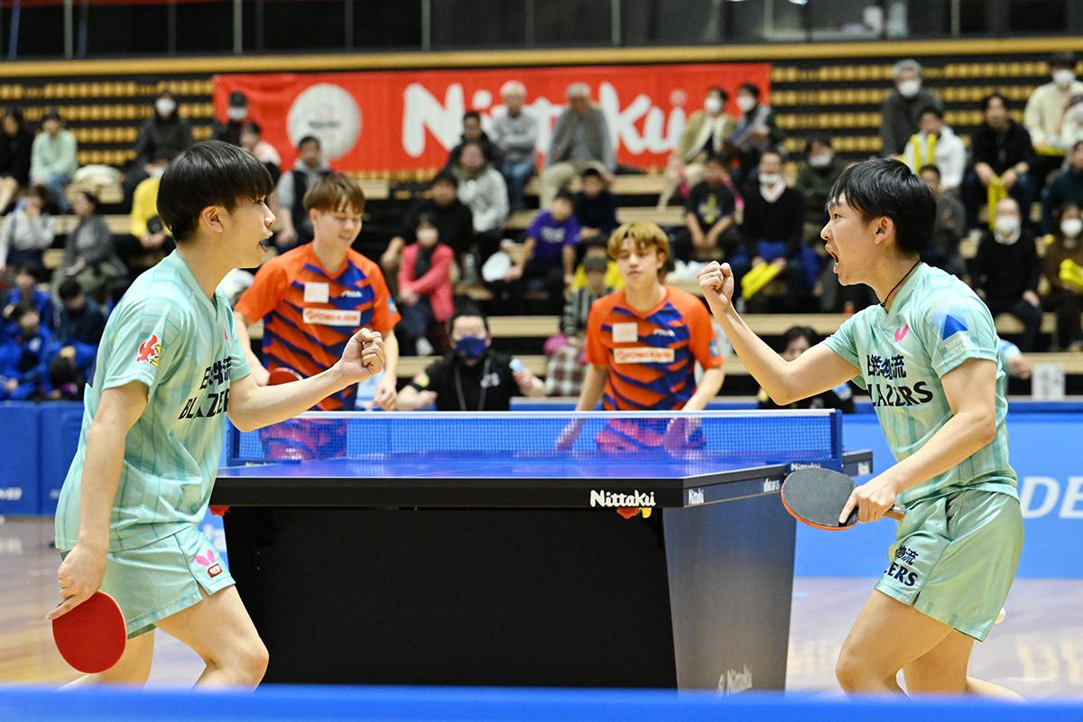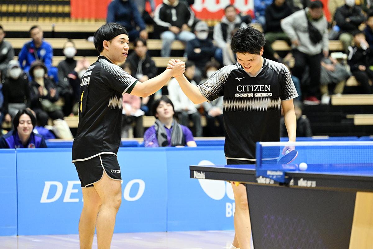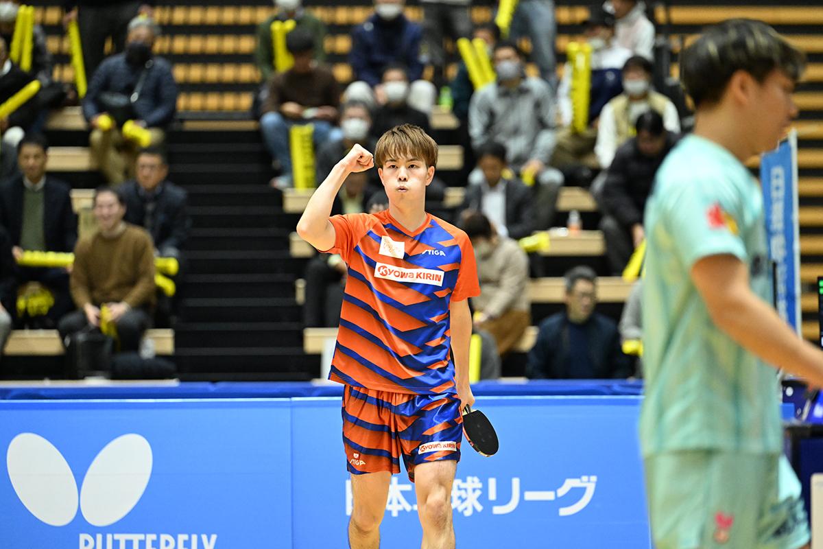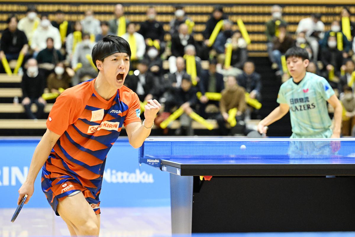 3番ダブルスは藤村/髙見が勝利して日鉄物流ブレイザーズが意地を見せるが、4番でキャプテンの渡辺が気迫のこもった両ハンドでラリー巧者の高木和に打ち勝ち、協和キリンの勝利を決めた。