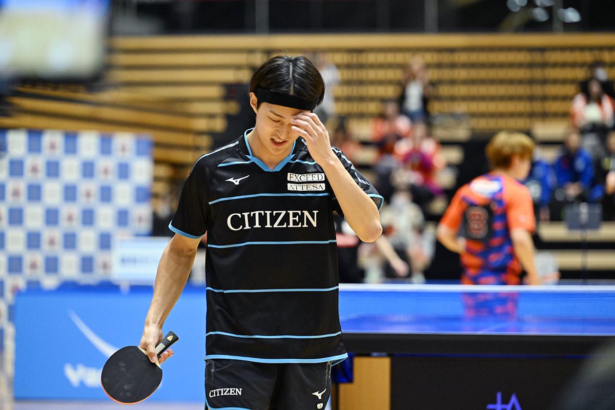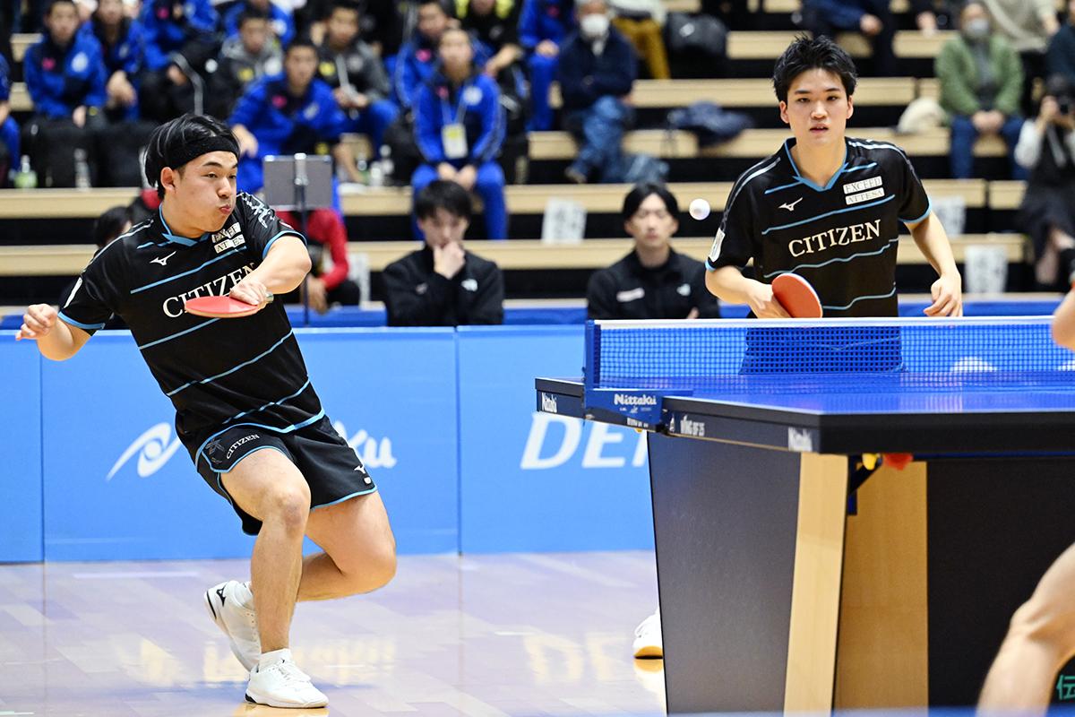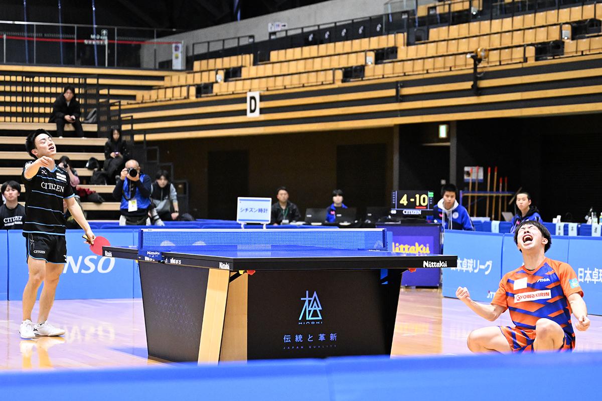 流れは完全に協和キリンペースだったが、決勝まで来て簡単に引き下がれないシチズン時計は3番で淺津/阿部が、渡辺/宇田との打ち合いをゲームオール9本でしのいで1点を返すと、4番で淺津が、ダブルスを勝った勢いそのままに鮮やかなカウンターで渡辺の両ハンドを打ち抜き、シチズン時計が試合を振り出しに戻す。