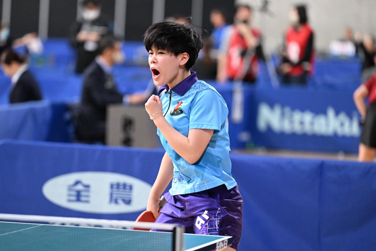 女子シングルス最年少11歳の松島美空(京都カグヤライズ)は、牧野美玲(星槎高横浜)と対戦。全中2位の実績のある牧野に対し、臆することなく両ハンドを振って1ゲームを奪う健闘を見せたが、牧野のふところの深い両ハンドにつかまり、勝利には届かなかった。「0対2で負けていて、我慢して1ゲームを取り返したのは良かったなと思いますが、その3ゲーム目に良かった『しっかり回転をかけて粘る』ことが4ゲーム目の途中から崩れてしまいました」と試合後の松島。女子シングルスでは敗れたが、この後に行われたジュニア女子2回戦では勝利し、3回戦に勝ち進んでいる。「(相手の)力も強くなっていくので、油断せず向かっていって楽しんで1ゲーム1ゲーム、一試合一試合を頑張りたい」と気持ちを切り替えてジュニア女子に挑む松島の勝ち上がりに期待したい。