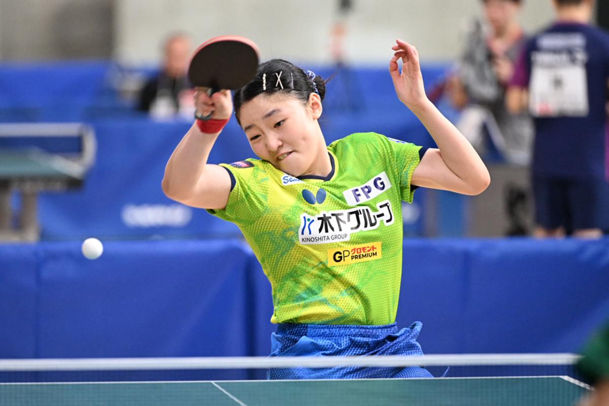 三連覇を狙う早田ひな(日本生命)は、5回戦でジュニア女子決勝を戦い終えたばかりの面手凛(山陽学園高)の勢いに押され、2ゲームを奪われたが、第6ゲームのジュースをしっかり物にして勝ち切ると、6回戦では三村優果(サンリツ)に快勝し、ベスト8進出。徐々にエンジンが掛かり始めているようだ。