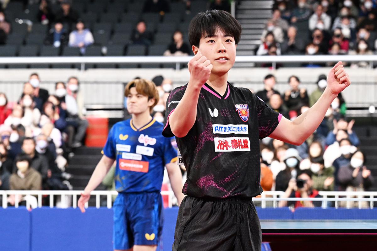 松島輝空(木下グループ)対曽根翔(T.T彩たま)の準々決勝は、序盤、1回戦から強敵を連破して勝ち上がってきた曽根が一撃チキータと強烈なバックハンドを浴びせて松島を押し込む。1対1で迎えた第3ゲームも曽根ペースで進んだが、このゲームを逆転で松島が奪うと、ロングサービスで曽根のチキータを封じつつ、フォア側を効果的に攻めて曽根のミスを誘い、松島がゲームカウント4対2で勝利して準決勝へ勝ち進んだ。