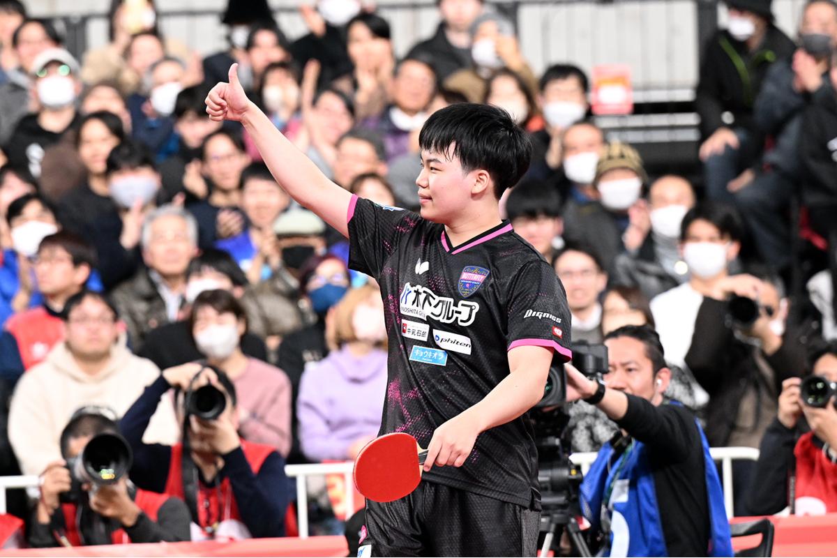 第4ゲームは、このまま終われない篠塚が意地で返すが、第5ゲームは再びゾーンに入った松島が面白いように強打を決めて篠塚を圧倒。篠塚のフォアハンドドライブがコートをオーバーして勝利を決めると、両手を高々と掲げて親指を立て、初優勝の喜びを表現した。
