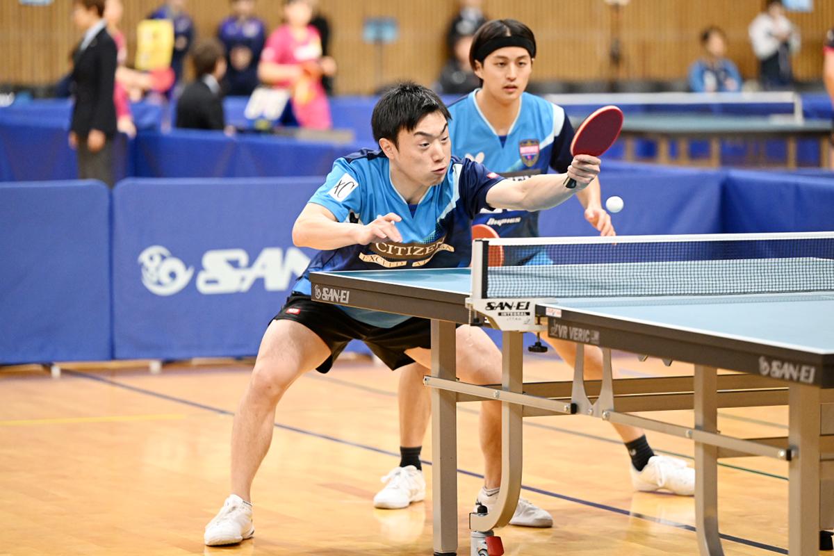 飯村悠太/木方圭介(明治大)はチキータからの鋭い両ハンドで有延大夢/田添響(T.T彩たま/岡山リベッツ)を下し、8強入り。