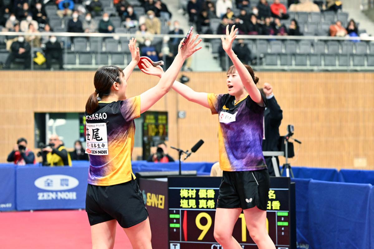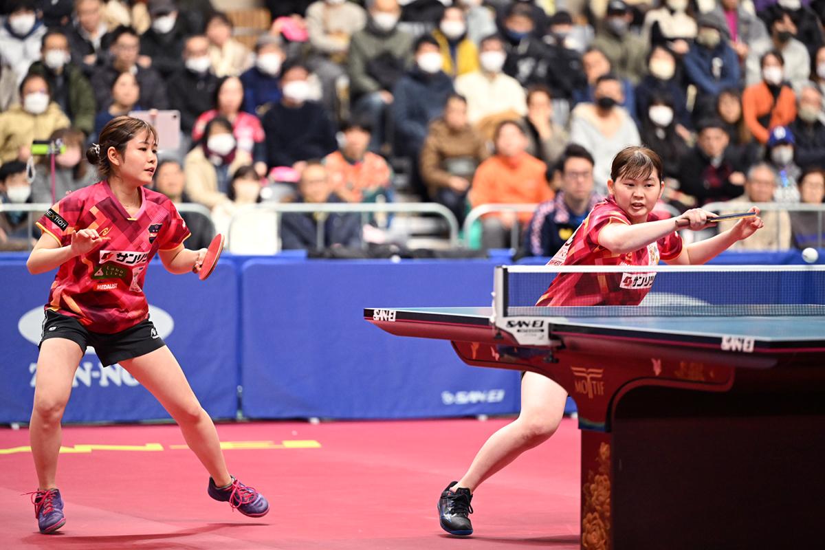 台上からの静かな探り合いになった第1ゲームは、終盤に強打で抜け出した麻生/笹尾が先制する。続く第2ゲームは日本生命ペアが攻め立て、サンリツペアがさばいてコースを突く展開で終盤までもつれるが、レシーブを強気に攻めた梅村/塩見がジュースで物にし、タイに戻す。
