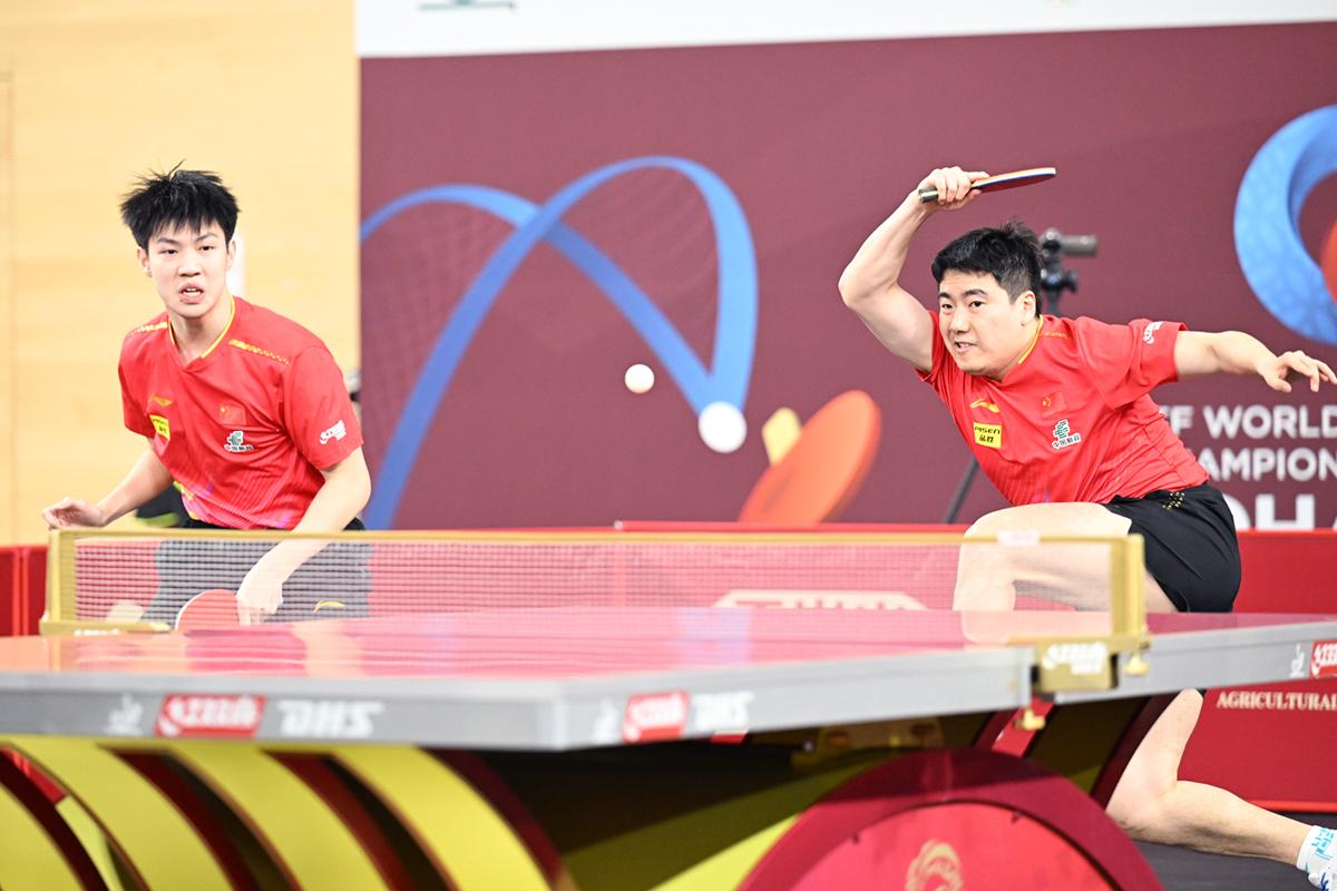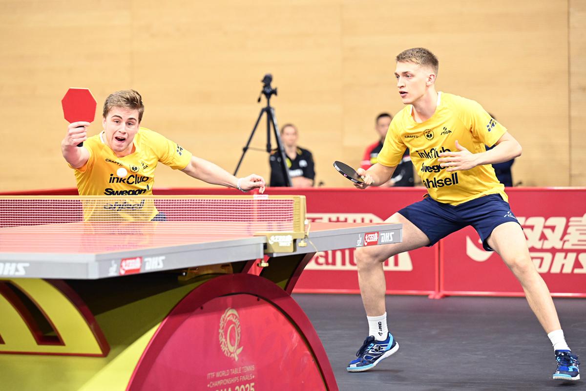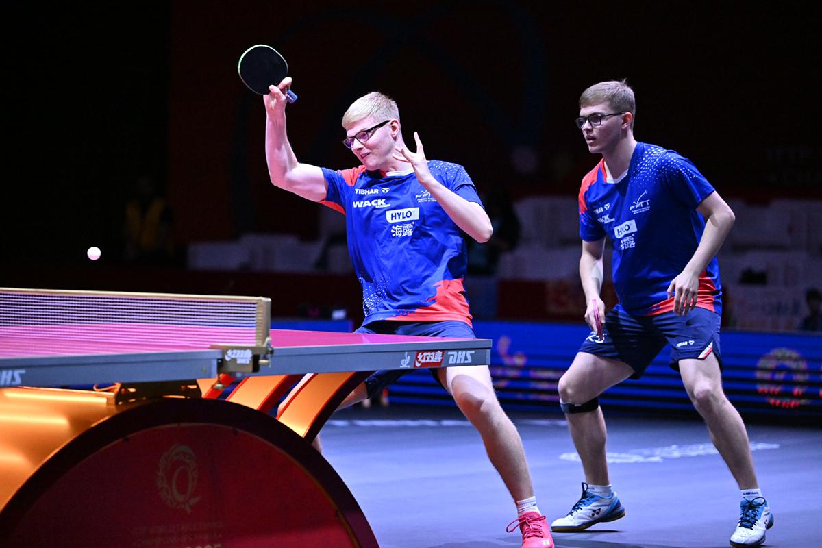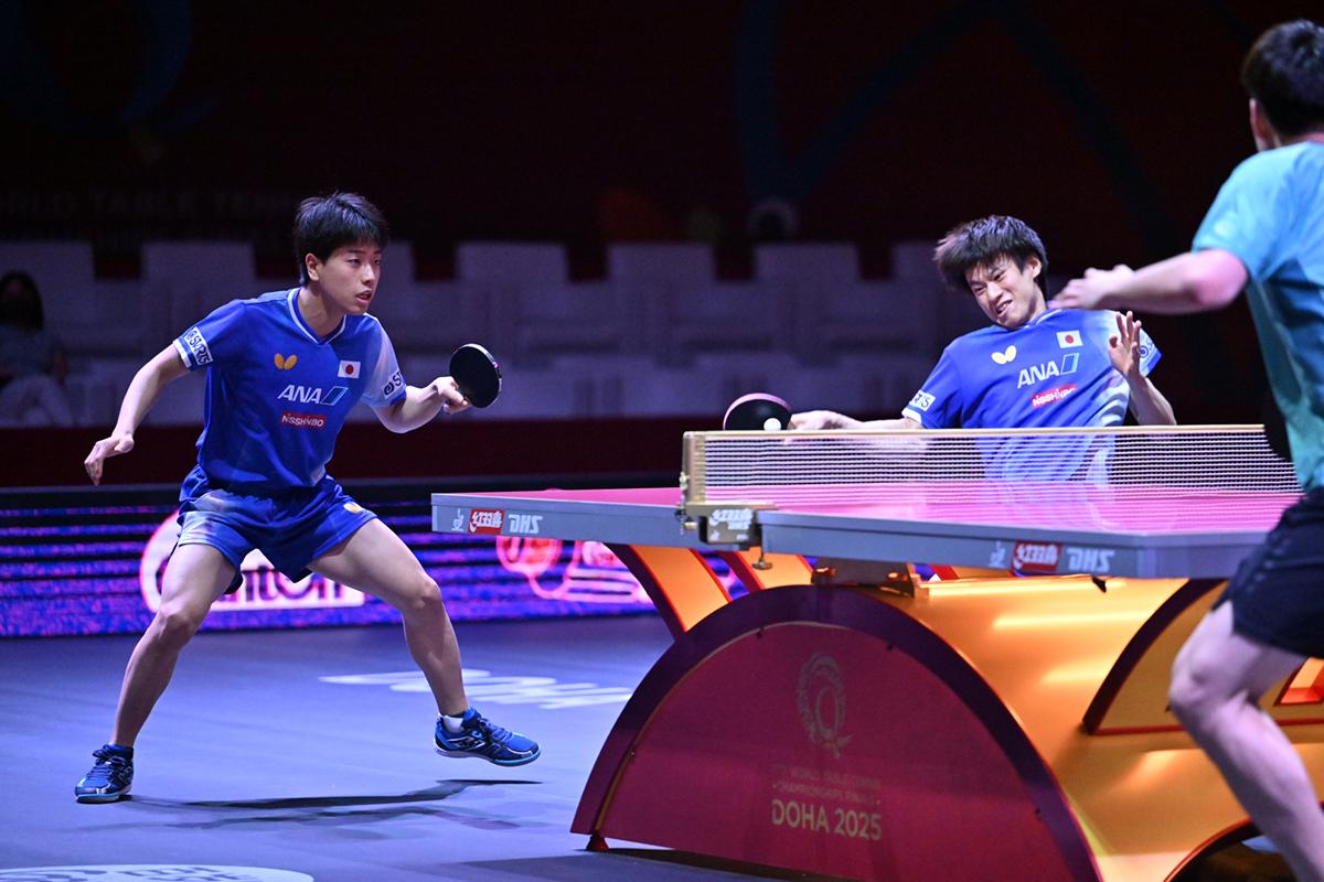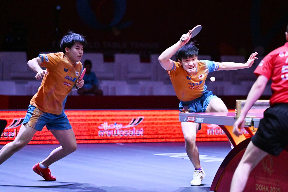 張本智和/松島輝空は、ベテランのガルドシュ/D.ハーベゾーン(オーストリア)と対戦。変化サービスとチキータで揺さぶり、鋭い両ハンドで畳み掛けて、オーストリアペアを圧倒し、3回戦進出。