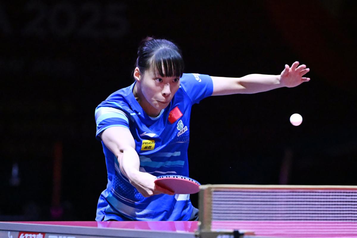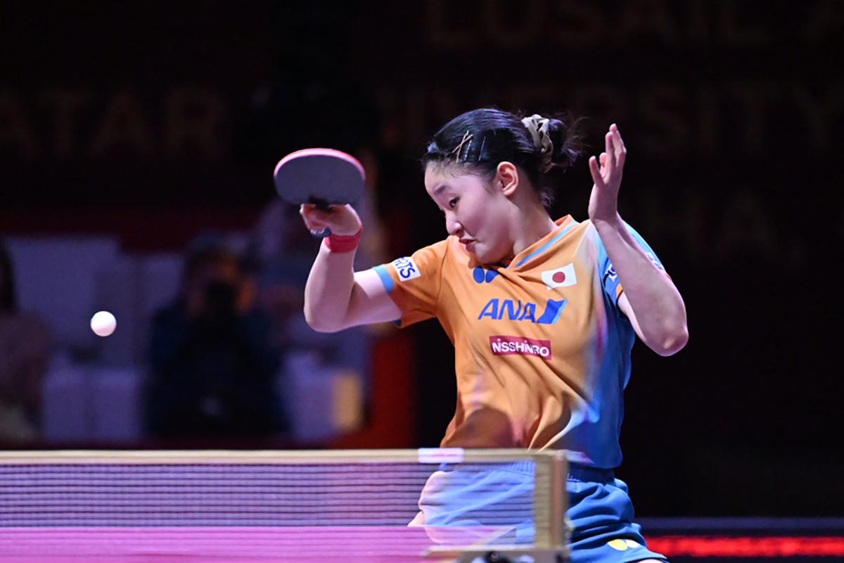 張本美和は、フォア面表ソフトラバーを貼るワン・ユアンの速攻を力強い両ハンドで跳ね返し、ストレート勝利で3回戦進出。