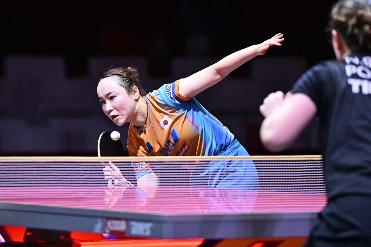 早田ひなはマテロバ(チェコ)と対戦。守備の強いマテロバに得意の強打を返され、ゲームカウント2対2と競り合ったが、「とにかく今日は我慢するだけ。自分がチャンスになった時にはしっかりコースを狙い、とにかく耐えて戦いました」という早田が、粘り強く両ハンドを振って第5、第6ゲームを連取し、マテロバを振り切った。