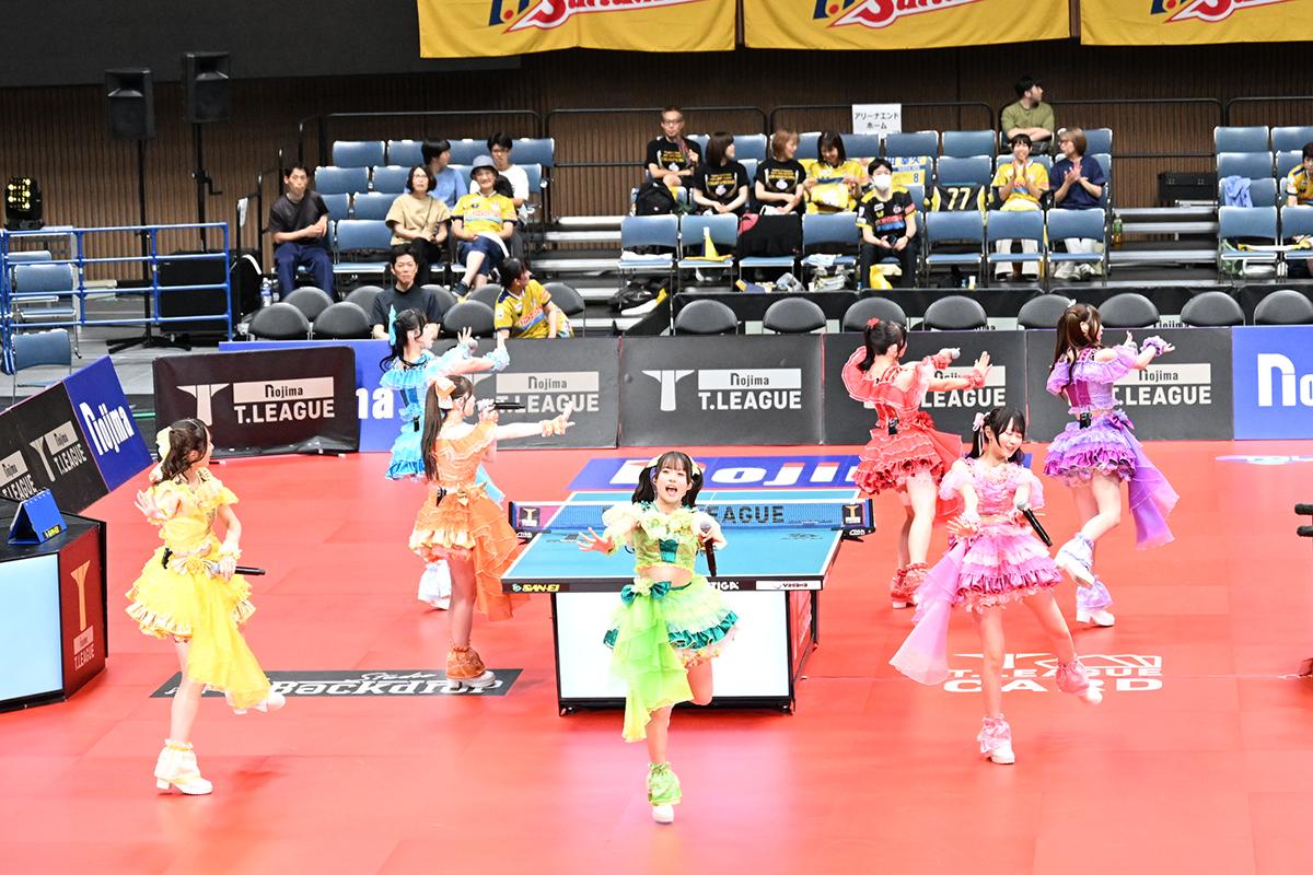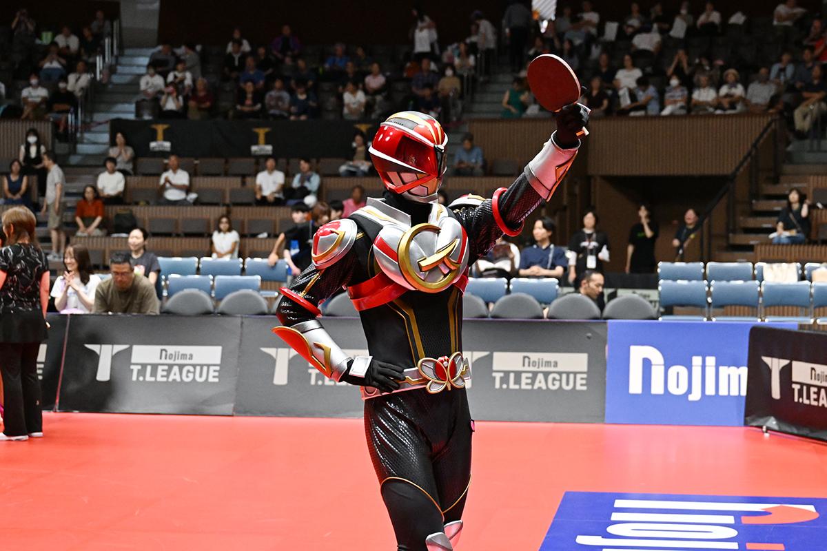 試合に先立って、Tリーグのオフィシャルユニフォームパートナーを務めるバタフライが展開する卓球ヒーロー、グレイザーマンやアイドルグループ『瞬きもせず』が登場し、新シーズン開幕を盛り上げた。