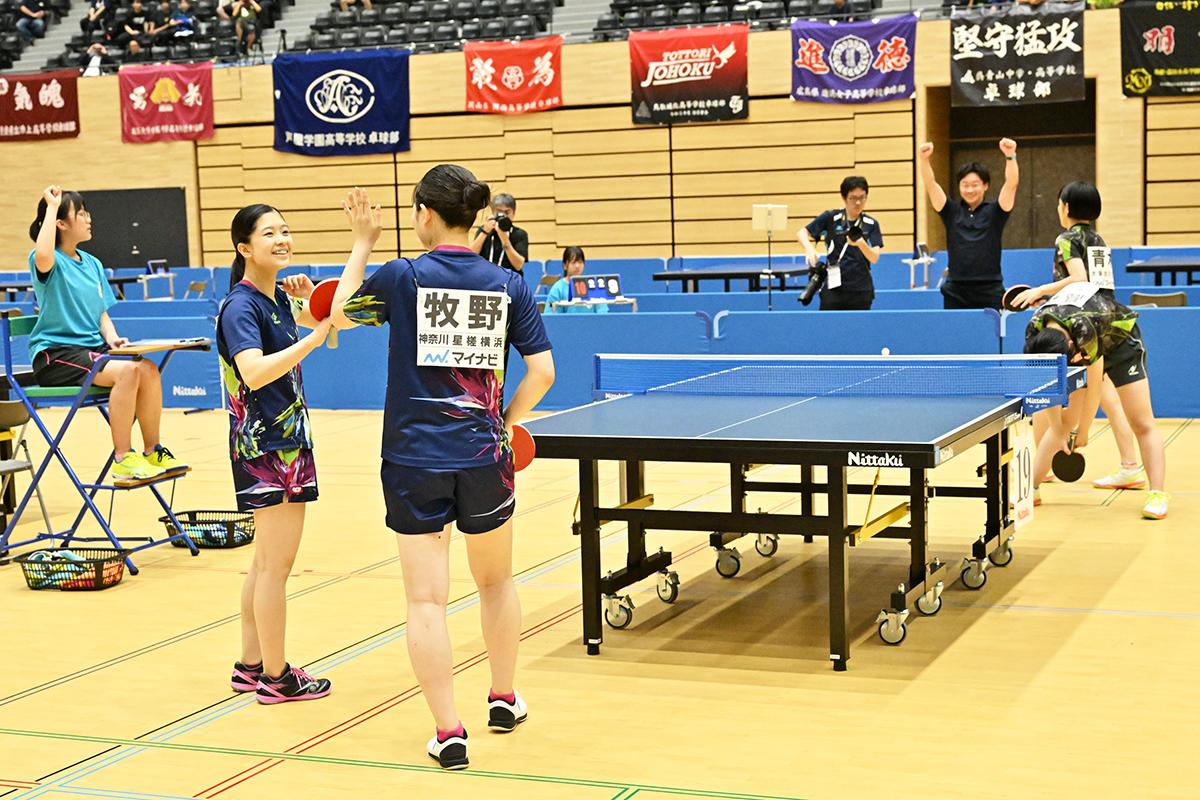 吉本/佐藤は、昨年女子学校対抗優勝経験者・吉本の素早い両ハンドと、佐藤のリーチの長さを生かした両ハンドが噛み合い、準々決勝で面手凛/齋木結心(山陽学園) に打ち勝って表彰台。