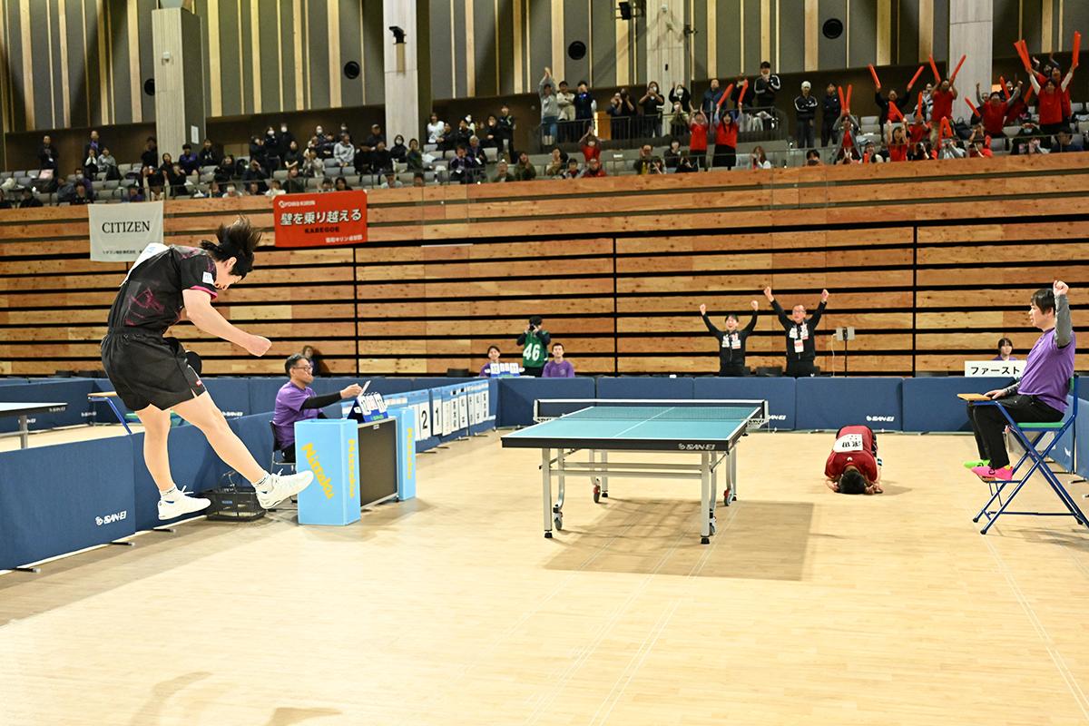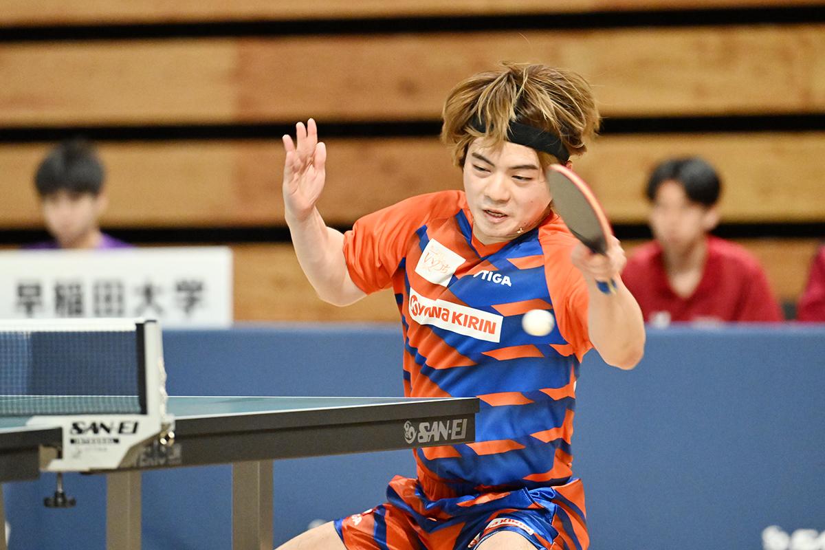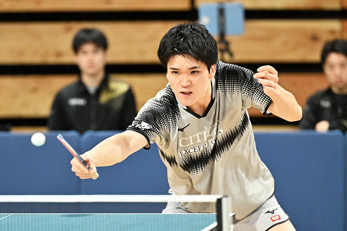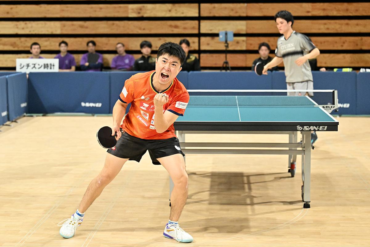 学生の勢いと球威に押される様子からばん回は厳しいと思われたが、3番の丹羽が流れを変える。日本卓球協会からの半年間の資格停止処分があけ、久しぶりの国内大会出場となった丹羽だが、ブランクを感じさせない軽快なプレーで濵田(尚)をストレートで下し、後半に望みをつなぐ。