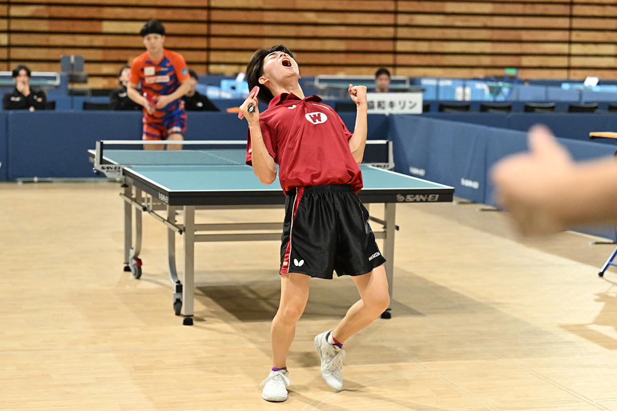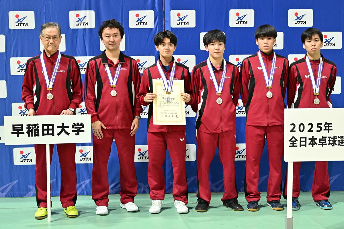 2位の早稲田大学は、準々決勝で関西卓球アカデミー、準決勝で協和キリンをいずれも3対2の大接戦の末に下して決勝進出。決勝のファースト戦でも2対0とリードし、優勝をつかみかけたが、意地で追い上げるファーストに逆転を許した。初優勝はならなかったが、実業団を強豪を連破して決勝まで勝ち進み、学生の力を大いに示した。