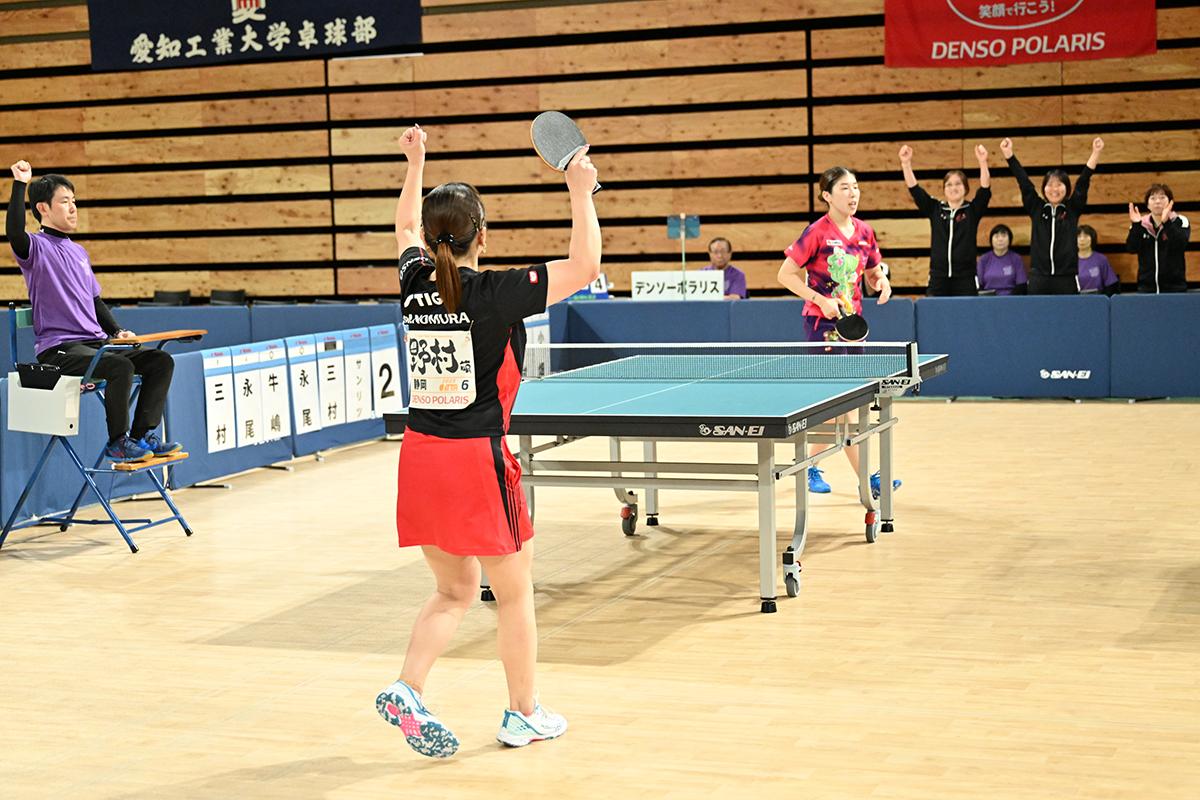 序盤は永尾の緩急と機を見たパワードライブに押され、0対2とリードされた野村だったが、第3ゲームからタイミングをしっかりはかってからの変化速攻で永尾を押し返し、3ゲーム連取で逆転勝利を収め、チームの優勝を決めた。