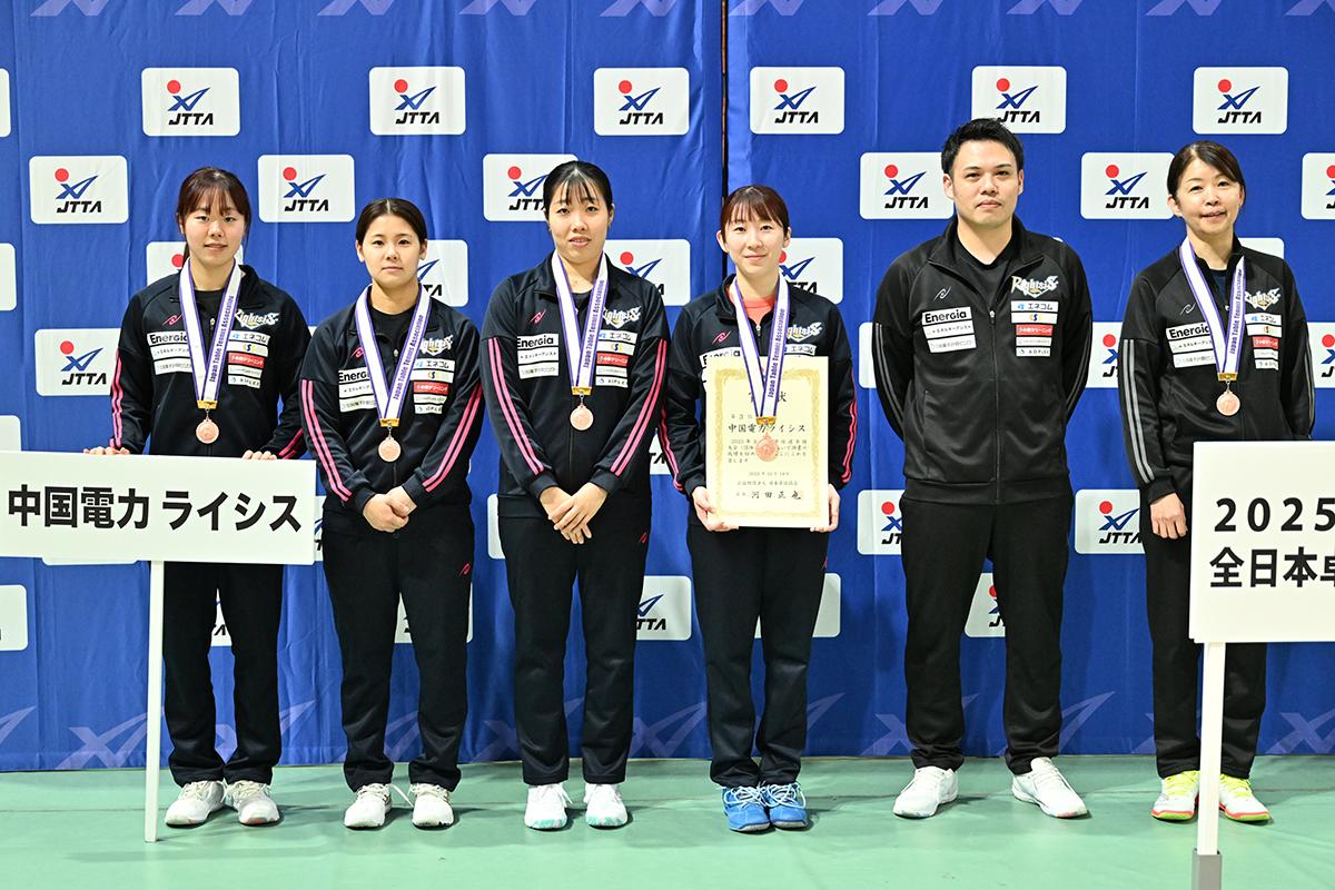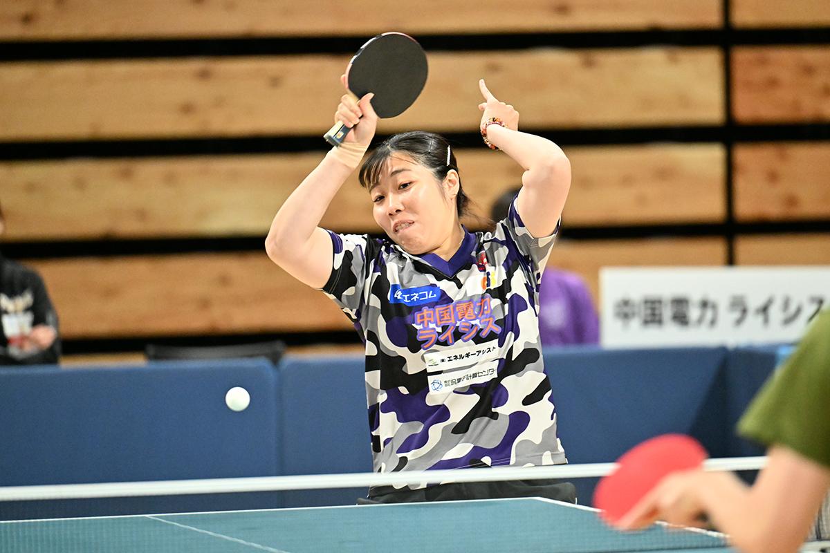 前回優勝の中国電力ライシスは準決勝でサンリツに敗れ、3位に終わった。サンリツ戦ではトップで枝廣が幸先良く先制したが、2番以降、牛嶋のカットと三村の速攻につかまり、逆転を許してしまった。