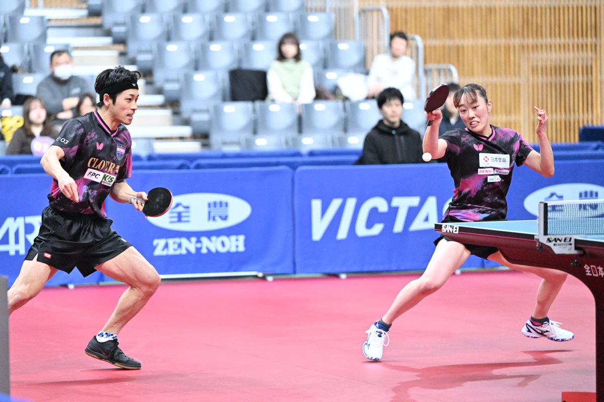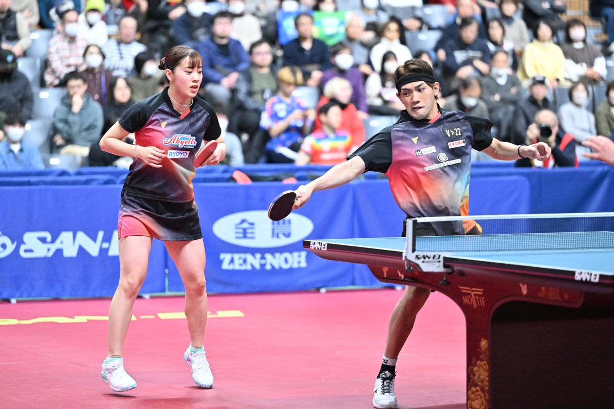 ダブルスの大会3日目となる1月31日(土)は、混合ダブルス準々決勝〜準決勝が行われ、松島輝空/張本美和(木下グループ)と坪井勇磨/赤江夏星(クローバー歯科カスピッズ/日本生命)が決勝に勝ち上がった。