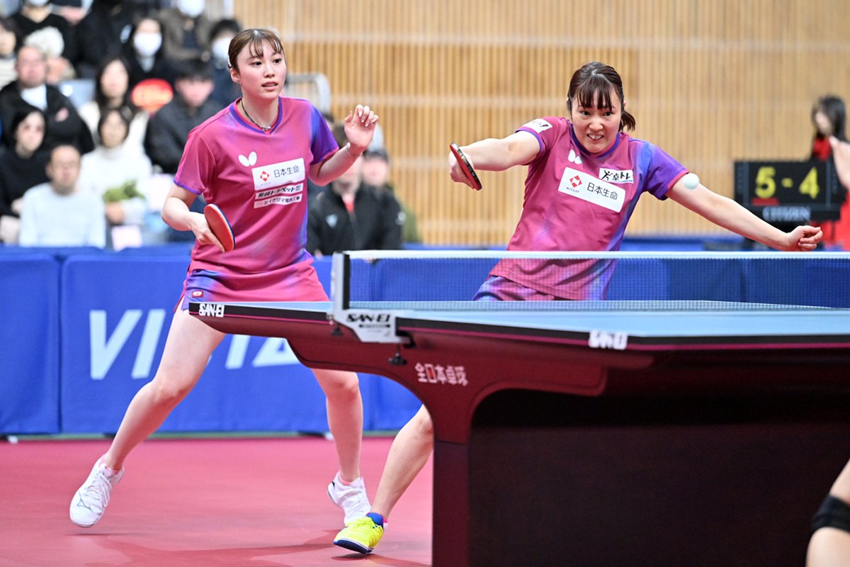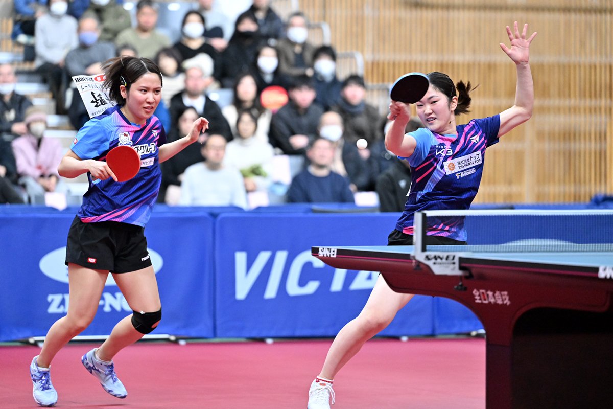ダブルスの大会最終日となる2月1日(日)は、女子ダブルス準決勝が行われ、平野美宇/木原美悠(木下グループ/トップおとめピンポンズ名古屋)と張本美和/長﨑美柚(木下グループ/木下アビエル神奈川)が決勝へ勝ち上がった。