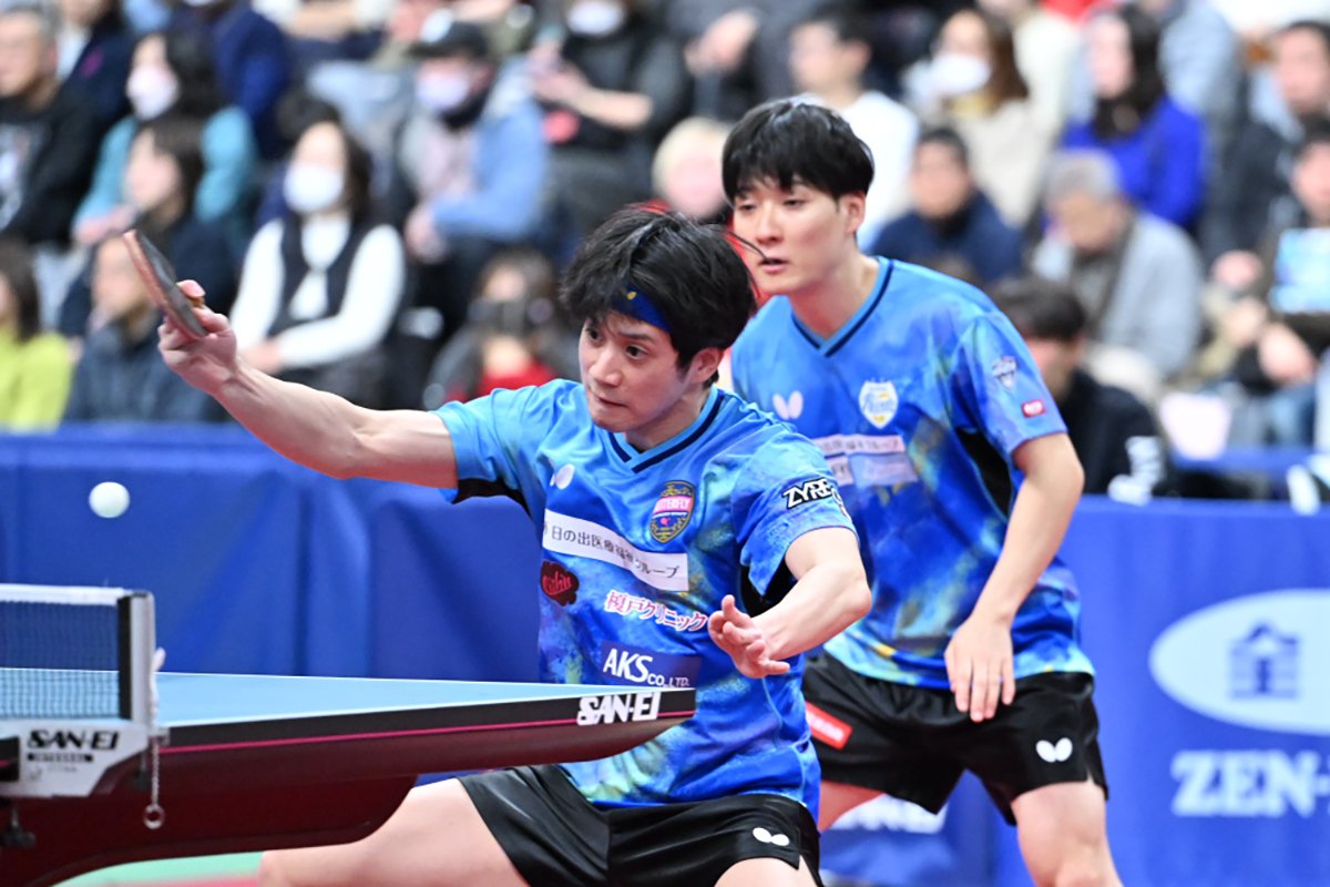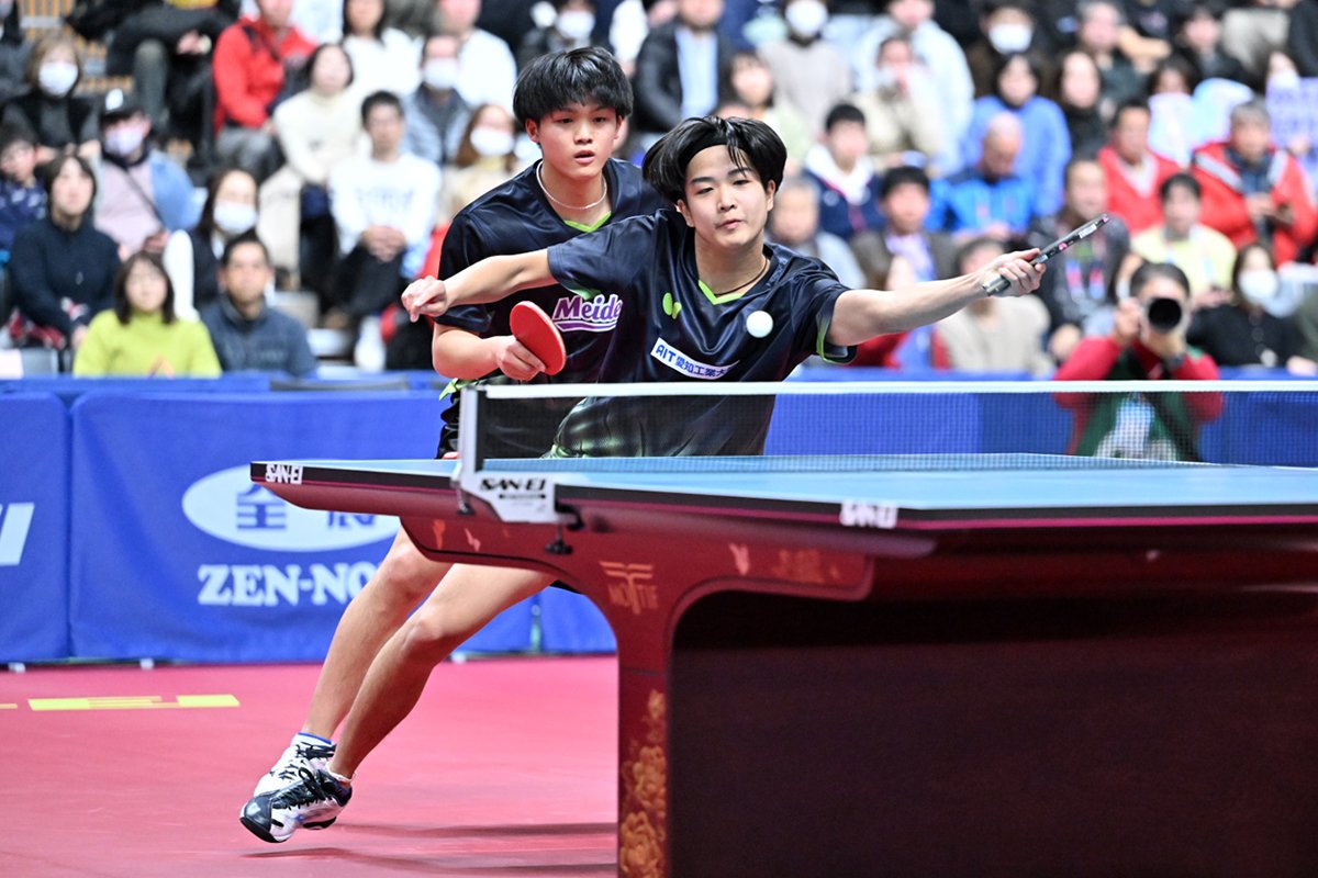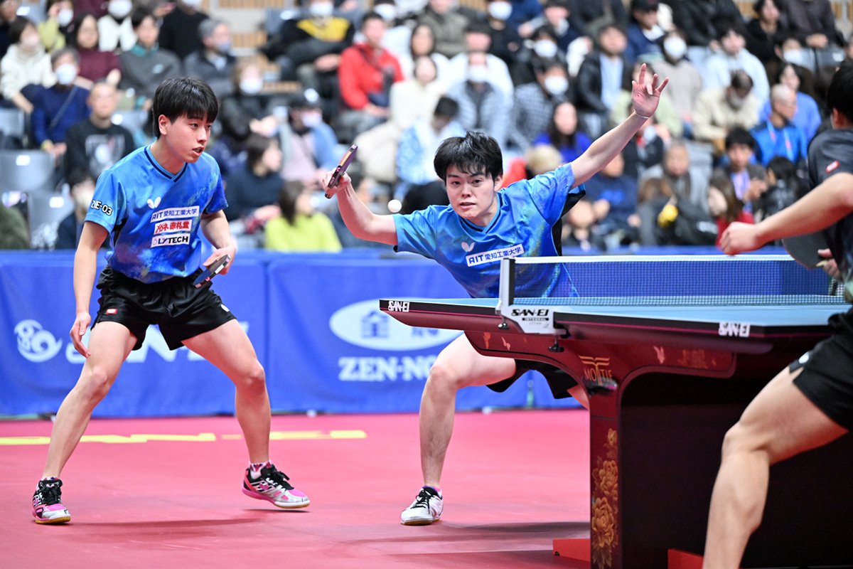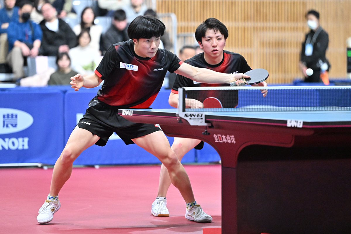 もう一方の準決勝もゲームオールにもつれる大接戦になったが、英田理志/松下大星(日の出医療福祉グループ)が鈴木颯/萩原啓至(愛知工業大)を振り切り、決勝進出を果たした。動きよく両ハンドを振って攻め立ててくる愛知工業大ペアに対し、英田がツッツキに変化をつけてチャンスをつくり、松下が鋭い両ハンドで仕留める連係で際どく勝ち切った。