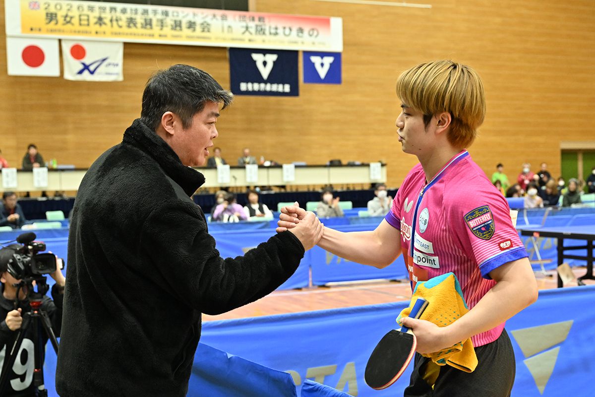川上選手は若手ではトップというか、今本当に勢いがあって、世界ユースや全日本ですごくいい成績を残して、今回も決勝に来て、負けられないというか、代表権もかかっていますけど、若手の壁というか、踏ん張れるということを意識しました。決勝に向けて一段とギアも上がりましたし、出だしからスイッチが入った状態で挑めたので、それが3対0で勝てた要因だと思います。