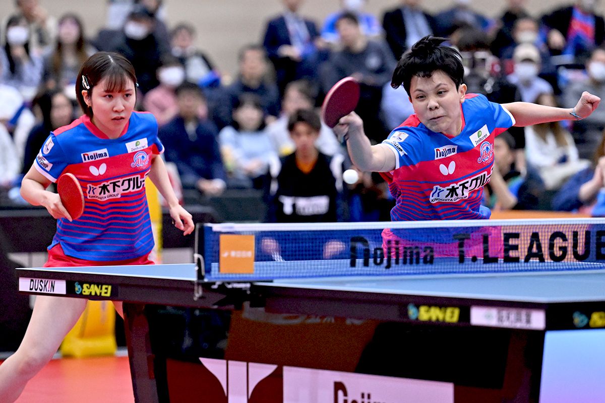 ダブルスからスタートするTリーグ。木下は左右コンビの平野美宇/鄭怡静、一方の日本ペイントは青木咲智/大藤沙月を持って来た。
