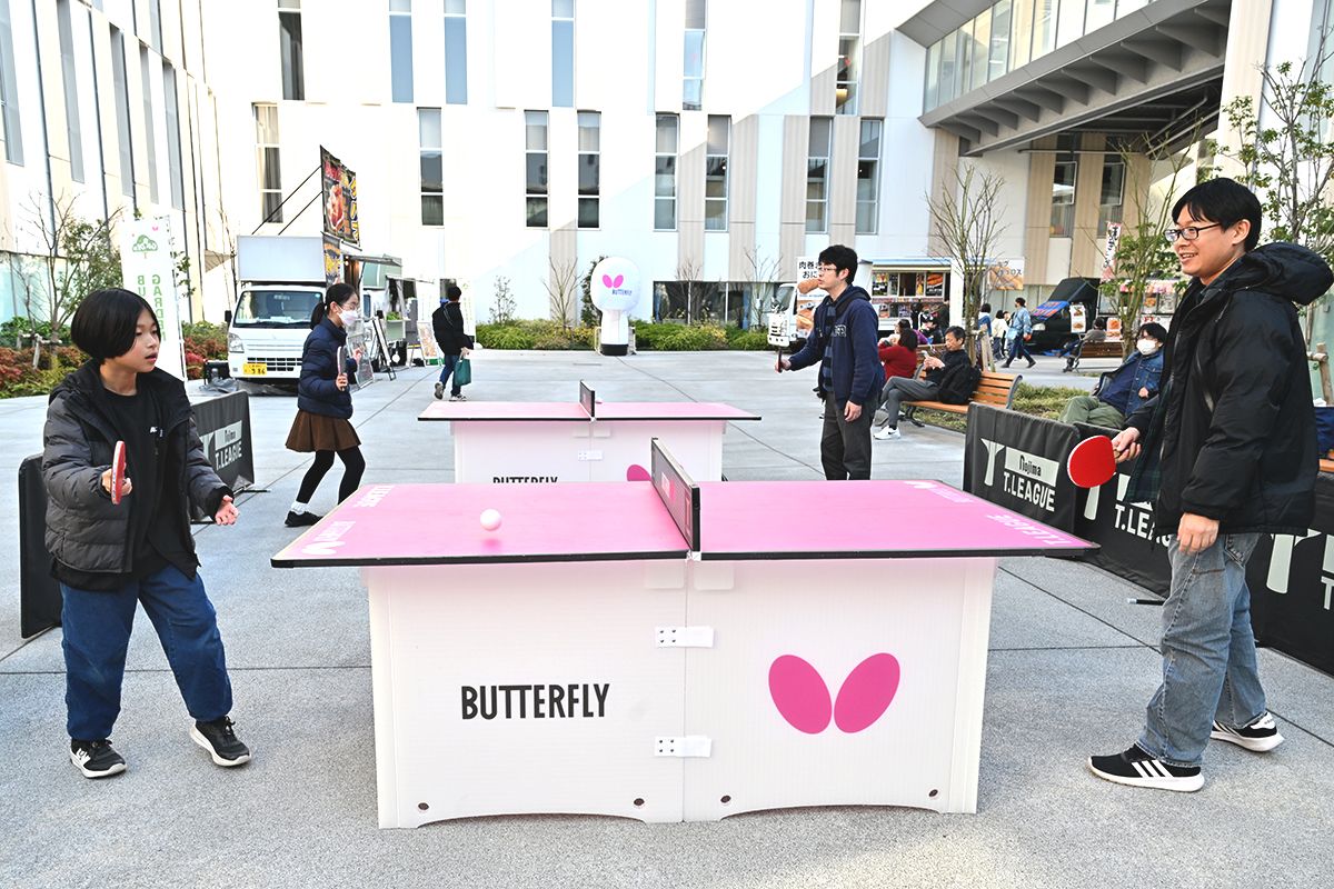 会場となった東洋大学赤羽台キャンパスの中庭では、文字通りの「バタフライガーデン」が開かれ、小型の卓球台、ケバブや肉巻きおにぎりなどのキッチンカーが設置された。女子と男子の試合の合間に多くの観客が訪れ、屋外での卓球を楽しんだ。