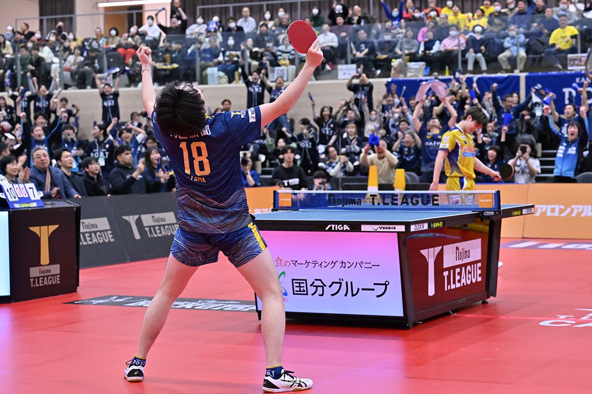 勝負が決まる5番、Tリーグ独自のビクトリーマッチは1ゲームのみ。金沢は西東監督が「谷垣と心中するつもり」という大黒柱の谷垣を連投。一方の彩たまは昨年のセミファイナルでビクトリーマッチを勝利したエース宇田にかける。